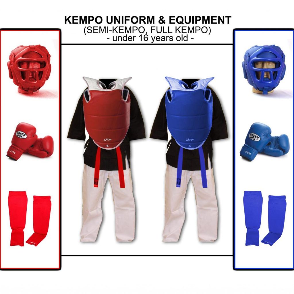 Gear: Black gi, colored belts, boxing gloves (8-10oz), shin guards, protective vest, headgear with mask.